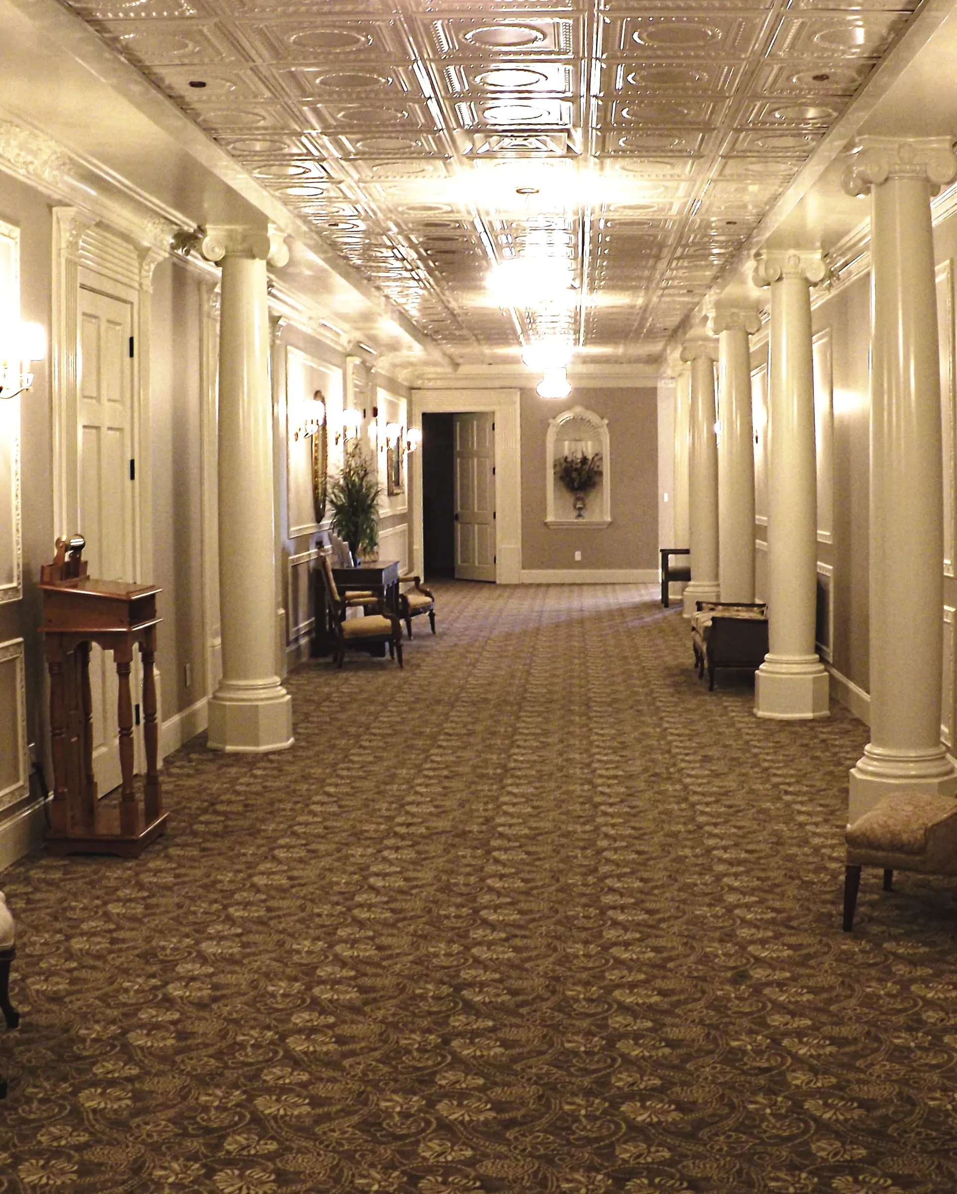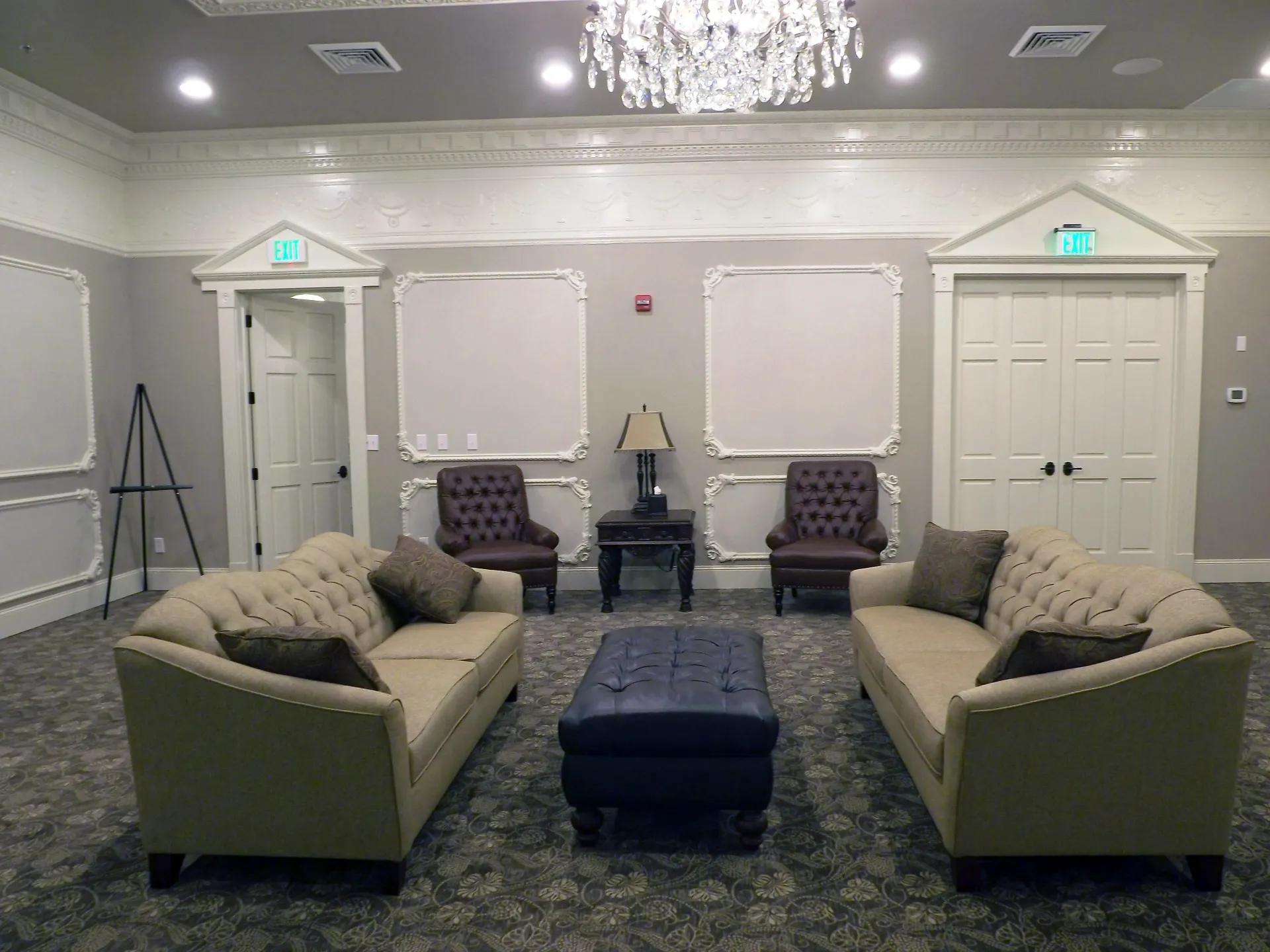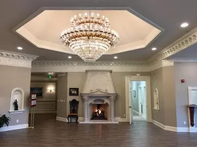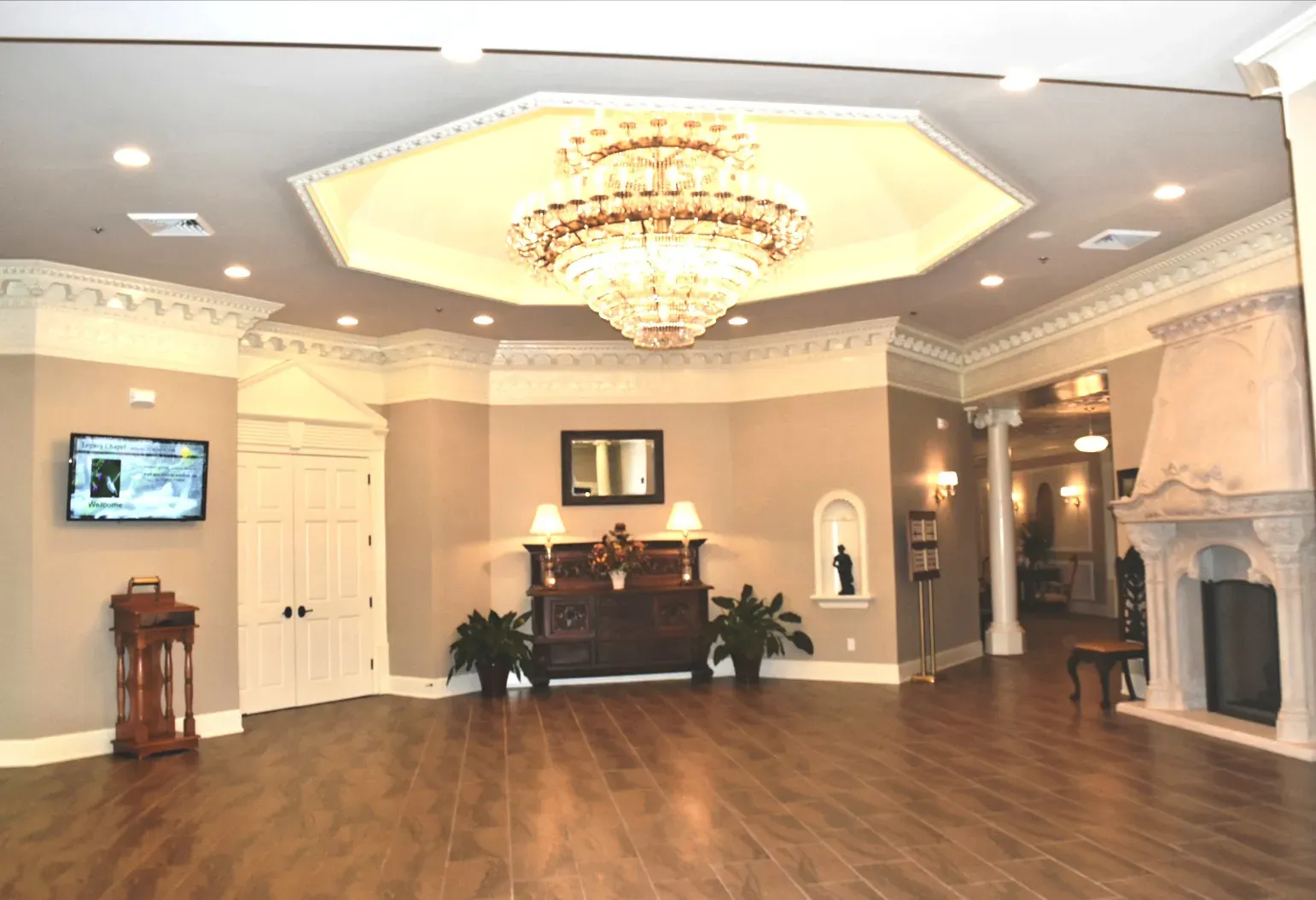 - Lobby: The lobby is a very open area for welcoming. The feel is that of home, with the fireplace and raised ceilings, you will not feel as though you are in a funeral home.
