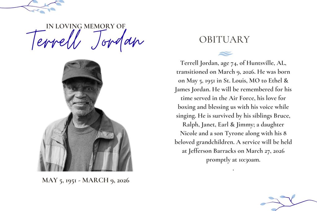 Terrell Jordan, age 74, of Huntsville, AL, transitioned on March 9, 2026. He was born on May 5, 1951 in St. Louis, MO to Ethel & James Jordan. He will be remembered for his time served in the Air Force, his love for boxing and blessing us with his voice while singing. He is survived by his siblings Bruce, Ralph, Janet, Earl & Jimmy; a daughter Nicole and a son Tyrone along with his 8 beloved grandchildren. A service will be held at Jefferson Barracks on March 27, 2026 promptly at 10:30am.